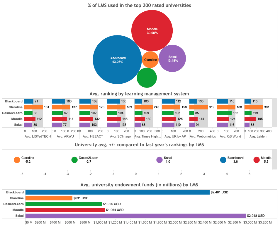 In my last post, I identified the top 200 universities. To do this, I compiled 8 world rankings and averaged out the rankings to find the top universities. Since I had most of the data, I thought it would be interesting to see what LMS (learning management system) the top universities used. Also, I wanted ... LMS at the top of the rankings Read More