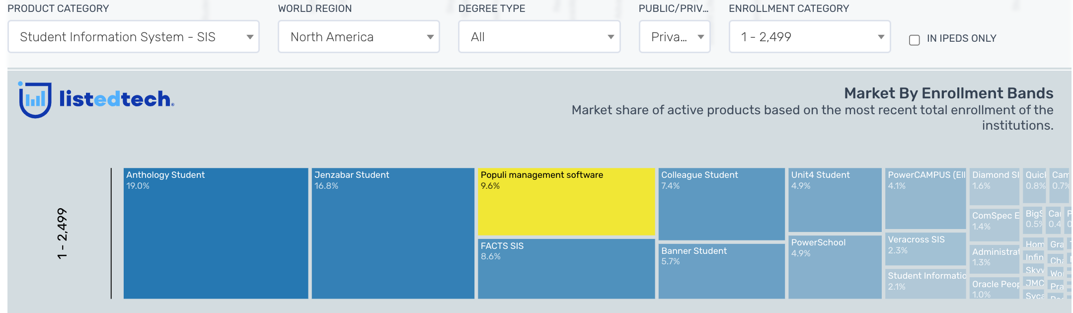 Last Thursday, we talked about Populi in one of our company profiles. As mentioned in this post, Populi is mostly implemented in smaller religious-oriented institutions. With this update on a post, we wanted to drill down further into the student information system product category. Instead of presenting the enrollment bands with the regular grouping (1-2,499; ... SIS Product Niches Emerge from New Enrollment Grouping Read More