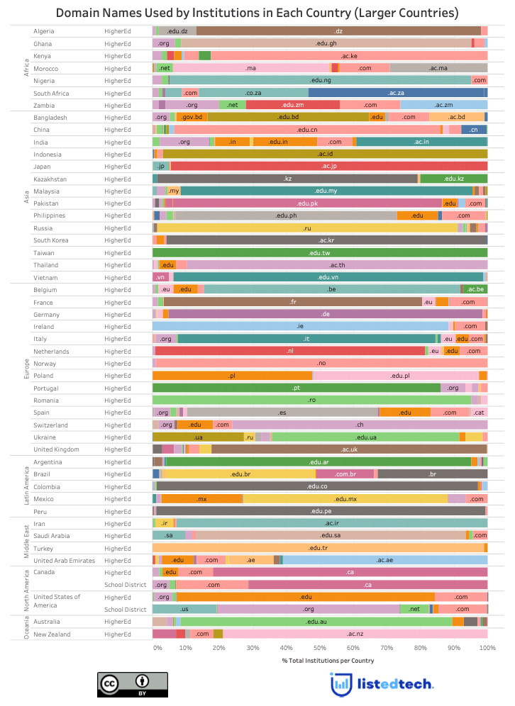Today, we are digging into a topic outside of our regular sandbox: Institution URLs and the type of information they can provide on an institution. To produce this post, we have gathered the data from the ListedTech database to sort the domains used by over 77,000 institutions across the globe.
