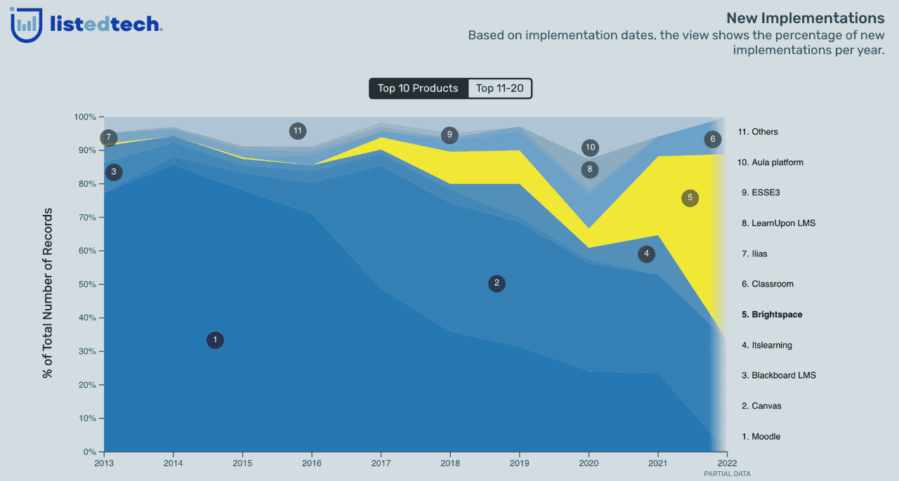 In North America, D2L has been present for over a decade and has been increasing its 10% of new implementations yearly. The year 2022 looks promising (note that SUNY is the major reason for this increase), and it looks like D2L is an even more important competitor to Canvas.