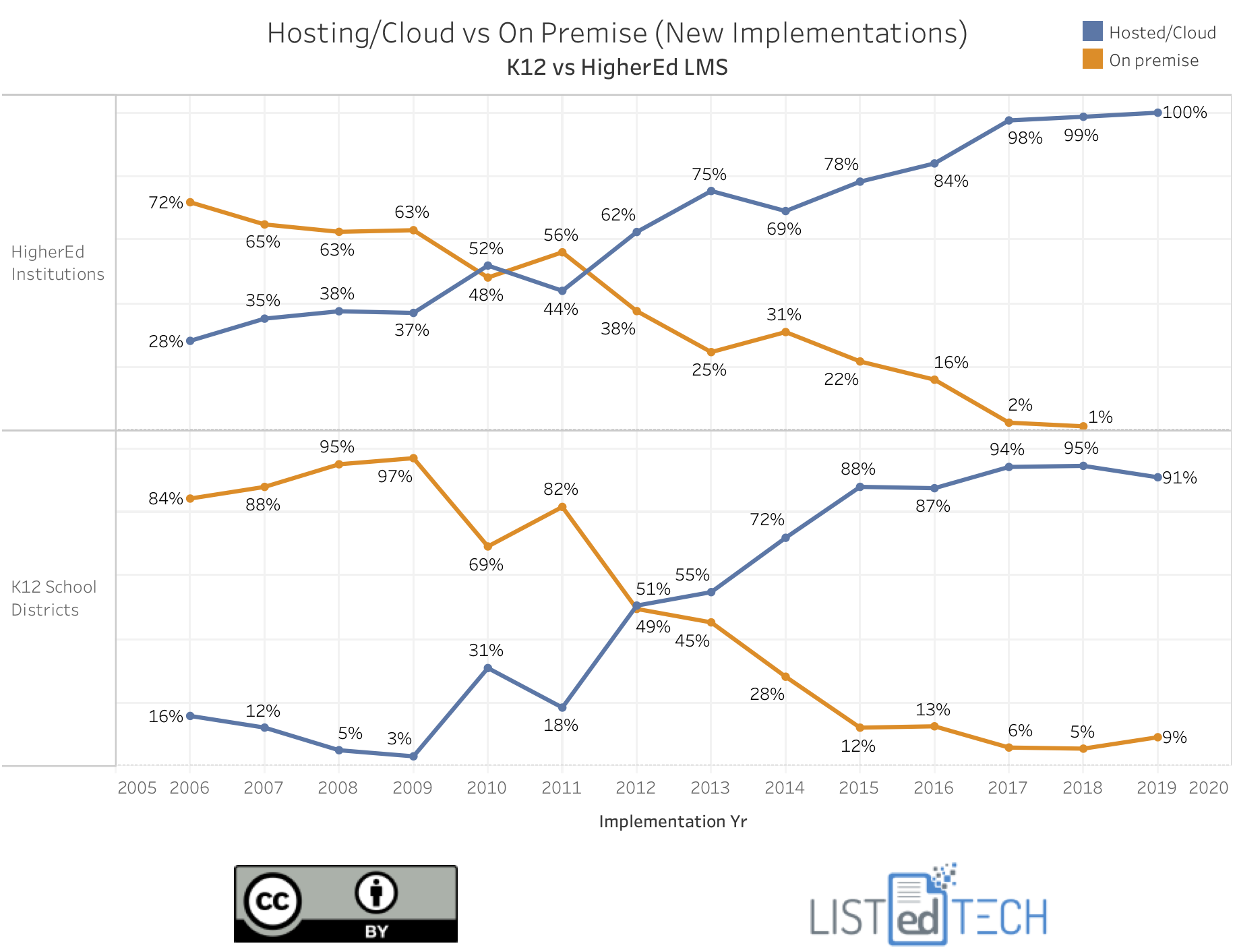 As of 2019, HigherEd and K-12 have similar rates of new cloud-hosted LMS implementations.